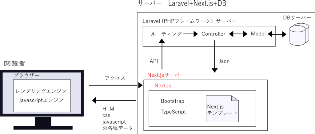 LaravelはAPIとして使い、Next.jsが必要なデータはJson形式でLaravelから受け取る構成