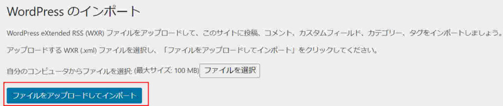 エクスポートした”サイト名.WordPress.西暦.月.日.xml”ファイルをインポートします。
