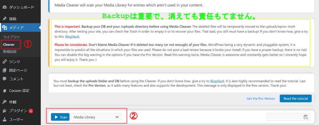 メディア内にCleanerが出現しますので、クリックするとバックアップをして下さいの説明と