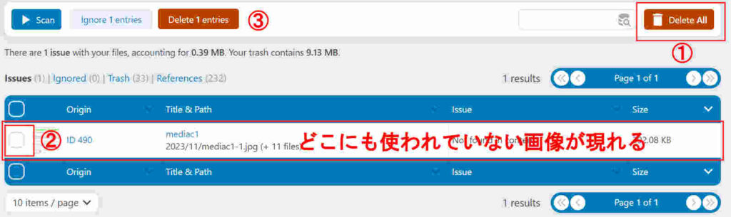 リンクの無い、画像が現れます。問題なければDelete All①を選択し、