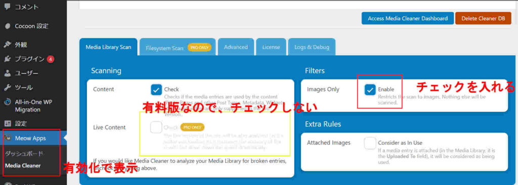 プラグインで”MediaCleaner”をインストールして、有効にすると