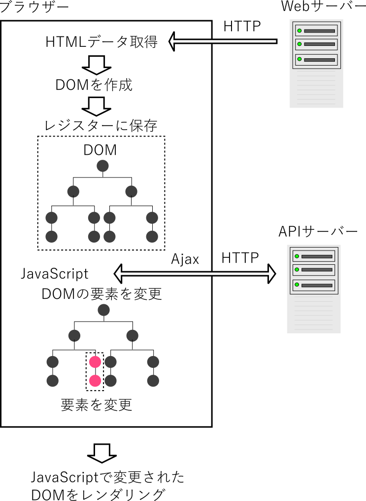 要素の変更を行って表示する。その為、ブラウザーが管理するDOMに変更が反映されずに、