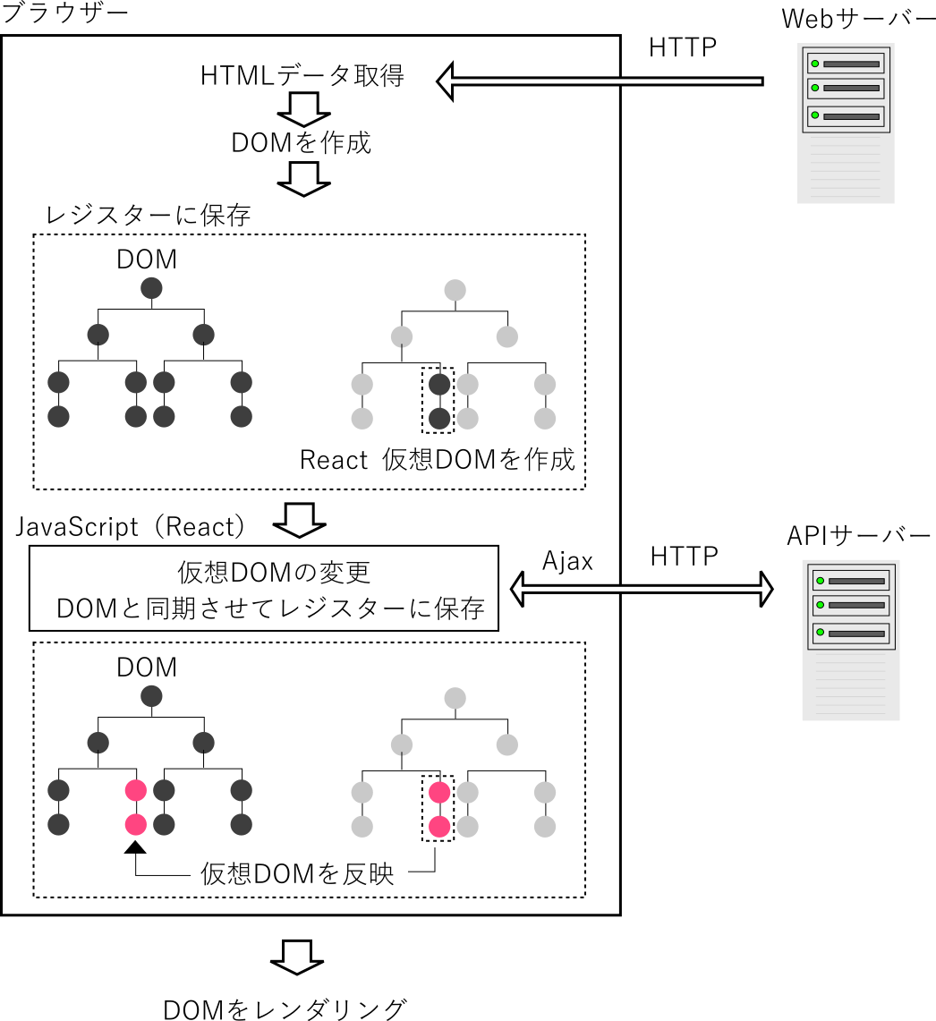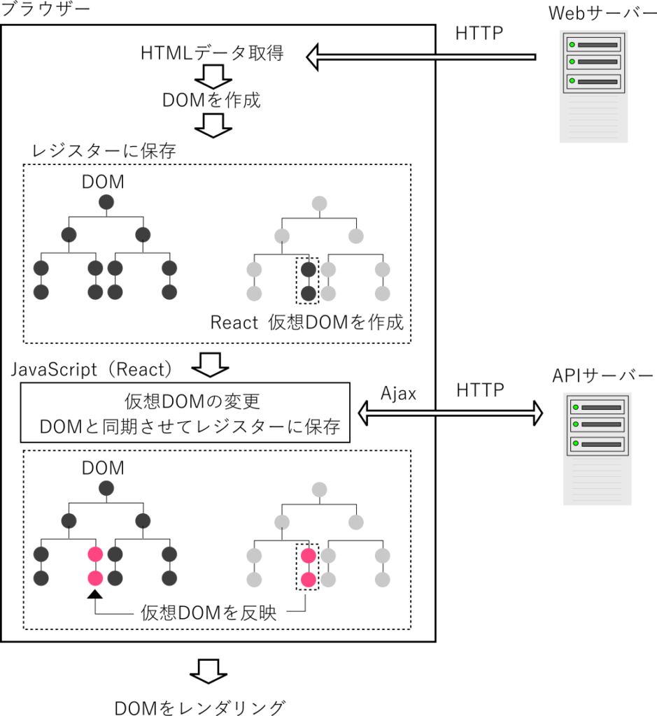 Reactは部分的な仮想DOMを作成し、仮想DOMの変更をブラウザー管理のDOMに反映させる