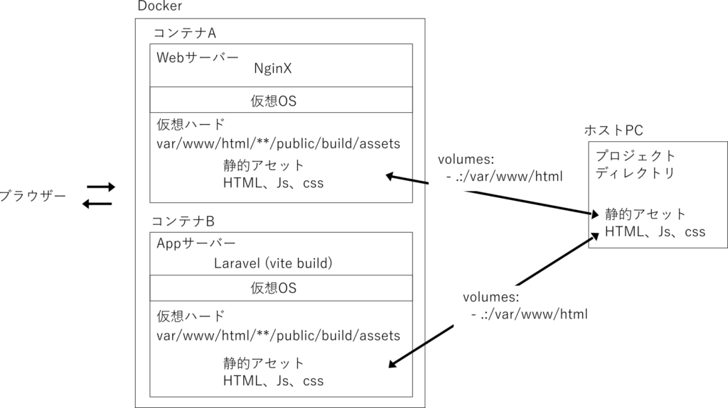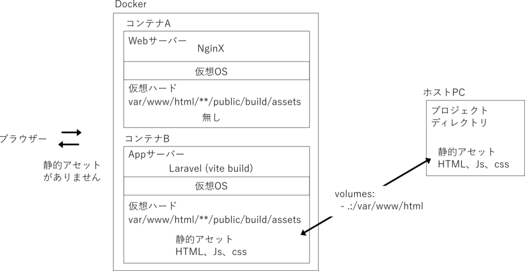 これで問題ないと思っていたのですが、NginXは自分のコンテナ内を探して、静的アセットが
