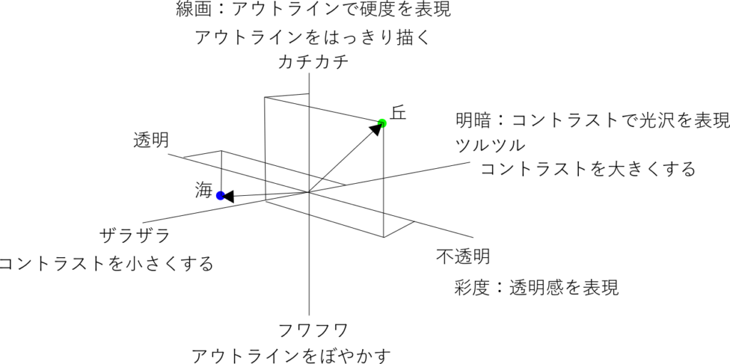 柔らかさの表現:アウトラインをはっきり描くかで表現する。